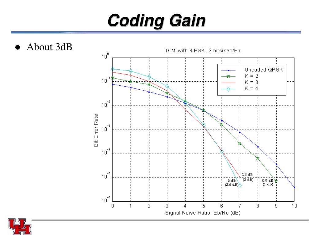Trellis Coded Modulation • Combine both encoding and modulation. (using Euclidean distance only) • Allow parallel transition in the trellis. • Has significant coding gain (3~4dB) without bandwidth compromise. • Has the same complexity (same amount of computation, same decoding time and same amount of memory needed). • Has great potential for fading channel. • Widely used in Modem