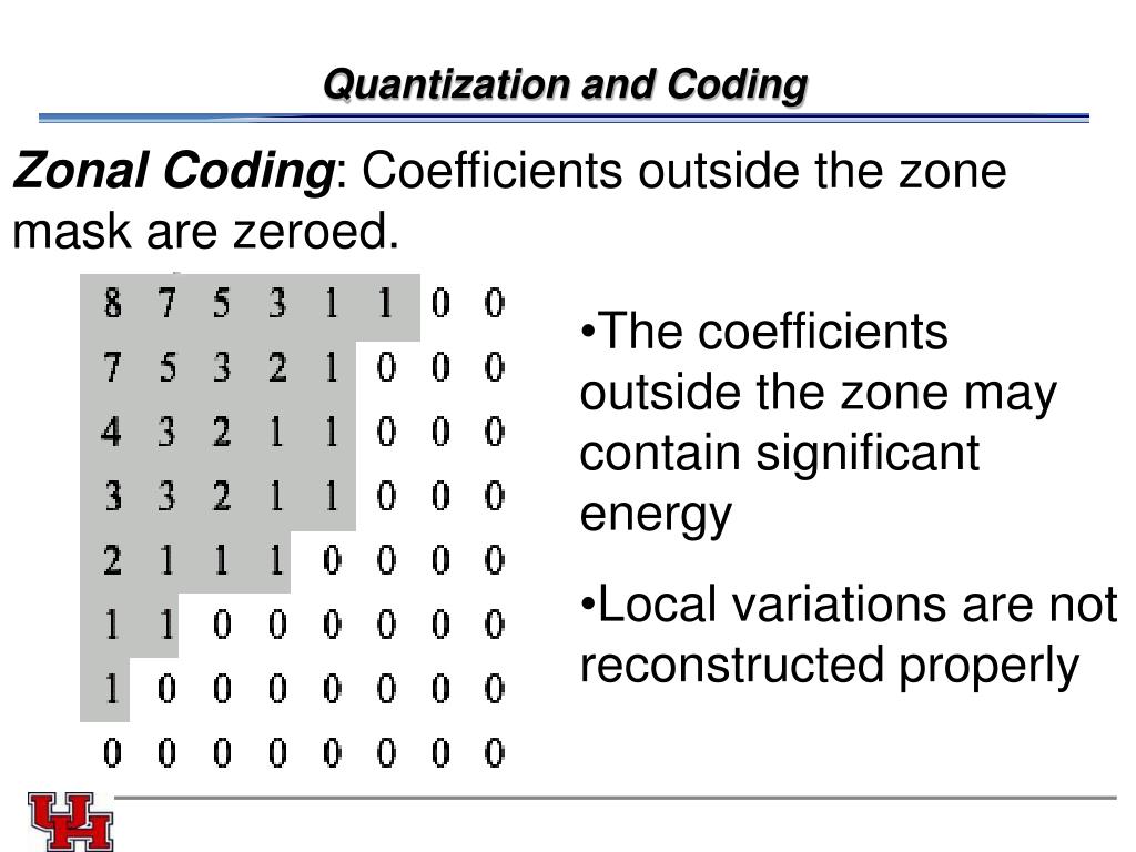 Quantization and Coding Zonal Coding: Coefficients outside the zone mask are zeroed. • The coefficients outside the zone may contain significant energy • Local variations are not reconstructed properly