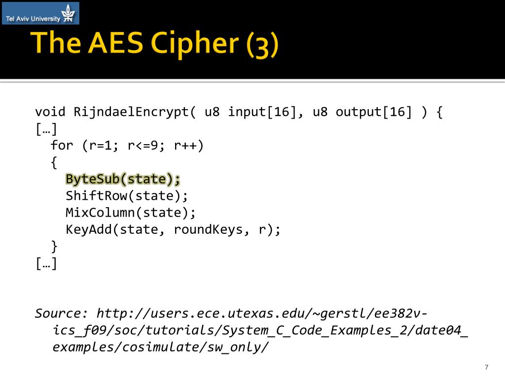 The AES Cipher (3) void RijndaelEncrypt( u8 input[16], u8 output[16] ) { […] for (r=1; r<=9; r++) { ByteSub(state); ShiftRow(state); MixColumn(state); KeyAdd(state, roundKeys, r); } […] Source: http://users.ece.utexas.edu/~gerstl/ee382v-ics_f09/soc/tutorials/System_C_Code_Examples_2/date04_examples/cosimulate/sw_only/