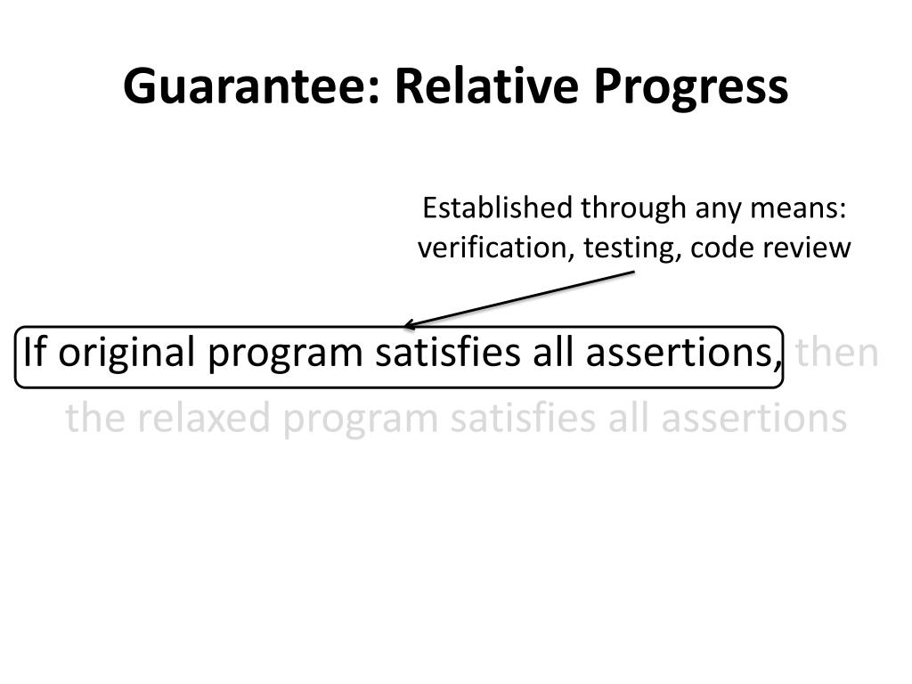 Guarantee: Relative Progress If original program satisfies all assertions, then the relaxed program satisfies all assertions Established through any means: verification, testing, code review