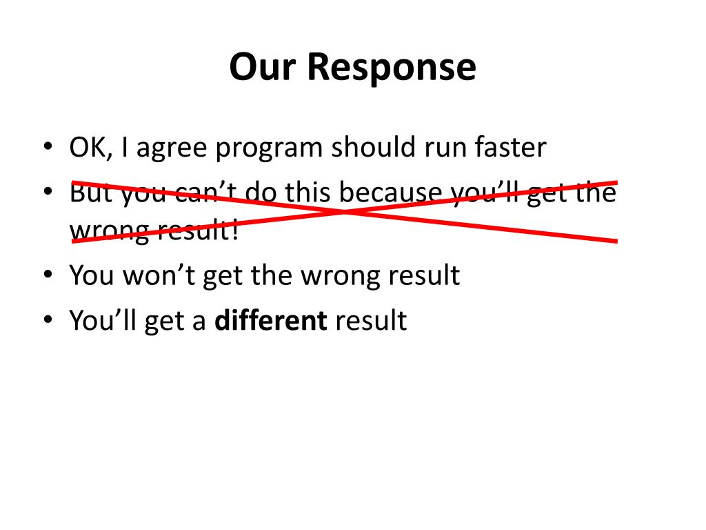 Our Response • OK, I agree program should run faster • But you can’t do this because you’ll get the wrong result! • You won’t get the wrong result • You’ll get a different result