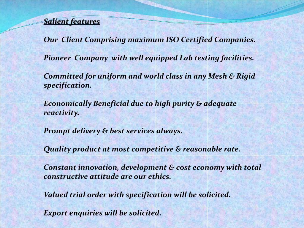 Salient features Our Client Comprising maximum ISO Certified Companies. Pioneer Company with well equipped Lab testing facilities. Committed for uniform and world class in any Mesh & Rigid specification. Economically Beneficial due to high purity & adequate reactivity. Prompt delivery & best services always. Quality product at most competitive & reasonable rate. Constant innovation, development & cost economy with total constructive attitude are our ethics. Valued trial order with specification will be solicited. Export enquiries will be solicited.
