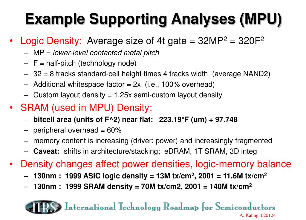 Example Supporting Analyses (MPU) • Logic Density: Average size of 4t gate = 32MP2 = 320F2 • MP = lower-level contacted metal pitch • F = half-pitch (technology node) • 32 = 8 tracks standard-cell height times 4 tracks width (average NAND2) • Additional whitespace factor = 2x (i.e., 100% overhead) • Custom layout density = 1.25x semi-custom layout density • SRAM (used in MPU) Density: • bitcell area (units of F^2) near flat: 223.19*F (um) + 97.748 • peripheral overhead = 60% • memory content is increasing (driver: power) and increasingly fragmented • Caveat: shifts in architecture/stacking; eDRAM, 1T SRAM, 3D integ • Density changes affect power densities, logic-memory balance • 130nm : 1999 ASIC logic density = 13M tx/cm2, 2001 = 11.6M tx/cm2 • 130nm : 1999 SRAM density = 70M tx/cm2, 2001 = 140M tx/cm2