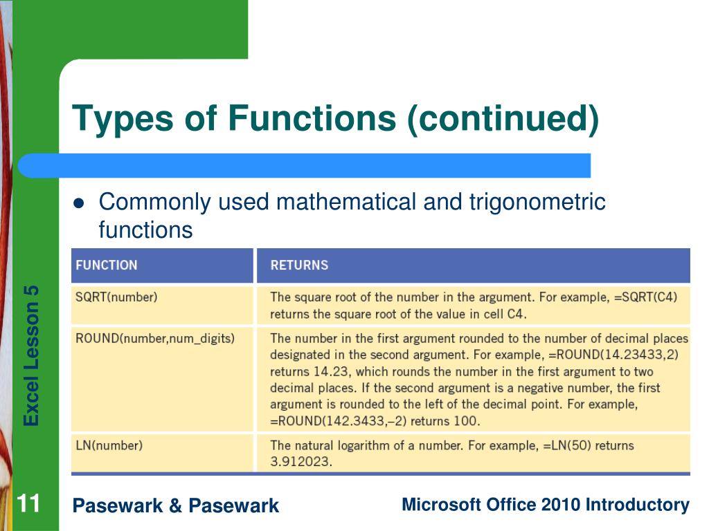 Excel Lesson 5 Using Functions. Microsoft Office 2010 Introductory. Pasewark & Pasewark. Objectives. Identify the parts of a function. Enter formulas with functions. Use functions to solve mathematical problems. Use functions to solve statistical problems.