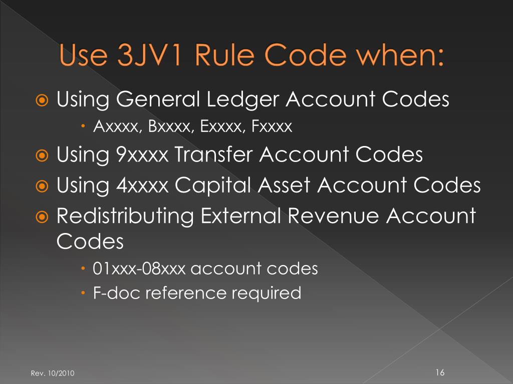 Use 3JV1 Rule Code when: • Using General Ledger Account Codes • Axxxx, Bxxxx, Exxxx, Fxxxx • Using 9xxxx Transfer Account Codes • Using 4xxxx Capital Asset Account Codes • Redistributing External Revenue Account Codes • 01xxx-08xxx account codes • F-doc reference required Rev. 10/2010