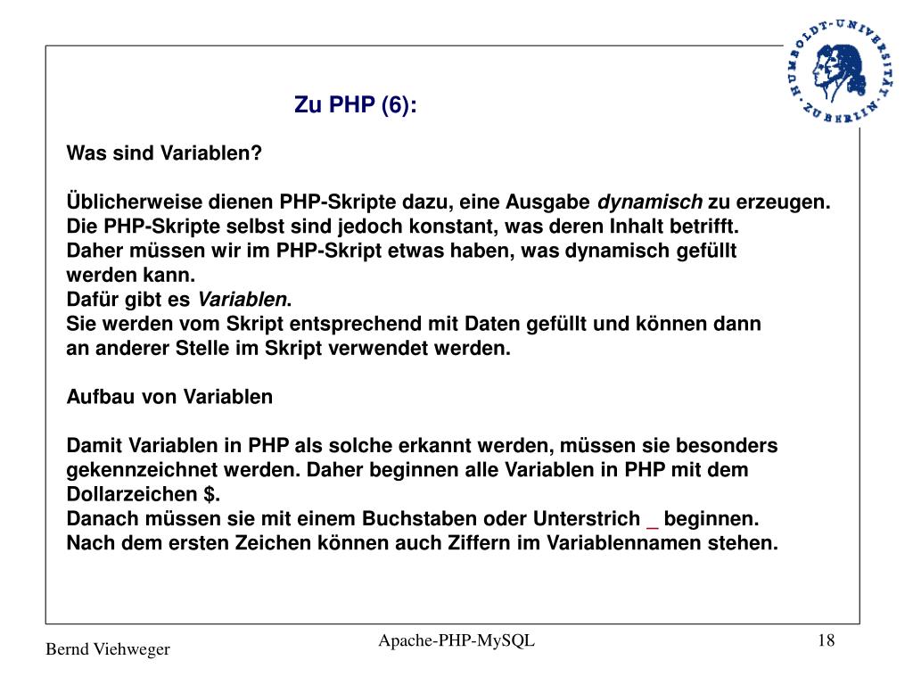 Zu PHP (7): <?php $gueltig $10_nicht_gueltig?> Variablen in PHP sind case-sensitiv, d.h. die Groß-/Kleinschreibung spielt eine Rolle und ist wichtig. Die Variable $foo ist eine andere als $FOO. Insbesondere bei den Superglobalen Variablen ist das wichtig, da diese z.B. $_GET lauten und nicht z.B. $_get. Apache-PHP-MySQL