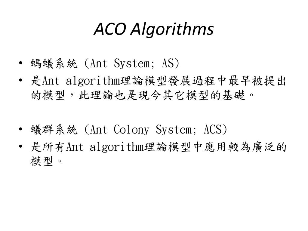 ACO Algorithms • 螞蟻系統 (Ant System; AS) • 是Ant algorithm理論模型發展過程中最早被提出的模型,此理論也是現今其它模型的基礎。 • 蟻群系統 (Ant Colony System; ACS) • 是所有Ant algorithm理論模型中應用較為廣泛的模型。