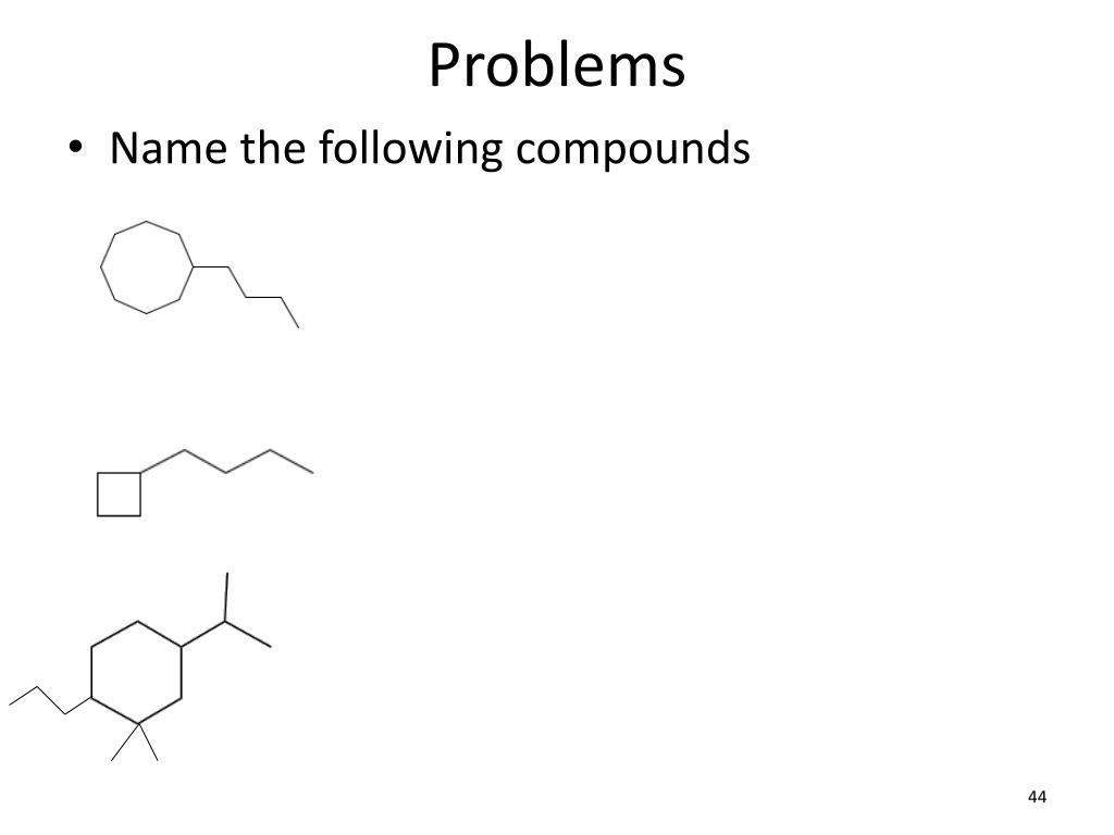 Nomenclature of Cyloalkanes The same nomenclature rules are followed Do not forget the cyclo part of the name If the noncyclic carbon chain contains more carbons than the ring, it is named as the parent chain 43