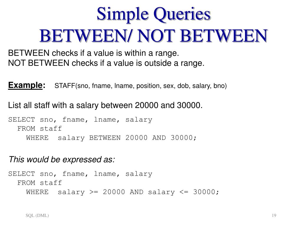 Simple QueriesBETWEEN/ NOT BETWEEN BETWEEN checks if a value is within a range. NOT BETWEEN checks if a value is outside a range. Example: STAFF(sno, fname, lname, position, sex, dob, salary, bno) List all staff with a salary between 20000 and 30000. SELECT sno, fname, lname, salary FROM staff WHERE salary BETWEEN 20000 AND 30000; This would be expressed as: SELECT sno, fname, lname, salary FROM staff WHERE salary >= 20000 AND salary <= 30000;