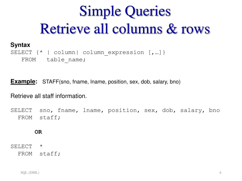 Simple QueriesRetrieve all columns & rows • Syntax • SELECT {* | column| column_expression [,…]} • FROM table_name; • Example: STAFF(sno, fname, lname, position, sex, dob, salary, bno) • Retrieve all staff information. • SELECT sno, fname, lname, position, sex, dob, salary, bno • FROM staff; • OR • SELECT * • FROM staff;