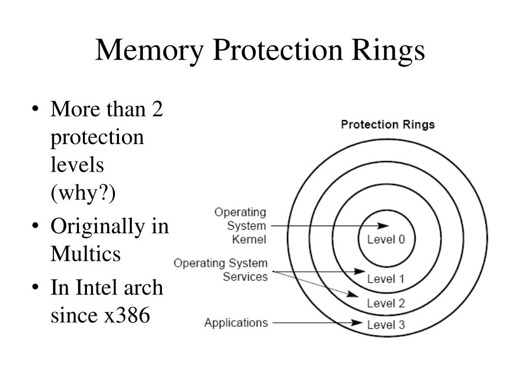 Memory Protection Rings • More than 2 protection levels (why?) • Originally in Multics • In Intel arch since x386