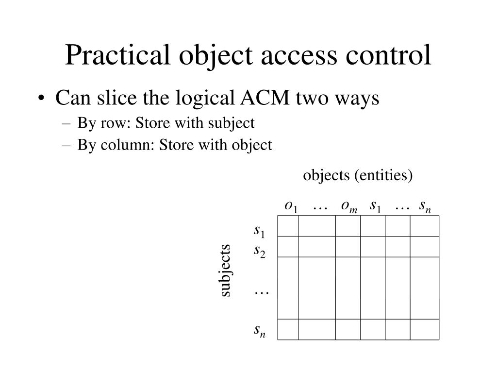 objects (entities) o1 … oms1 … sn s1 s2 … sn subjects Practical object access control • Can slice the logical ACM two ways • By row: Store with subject • By column: Store with object