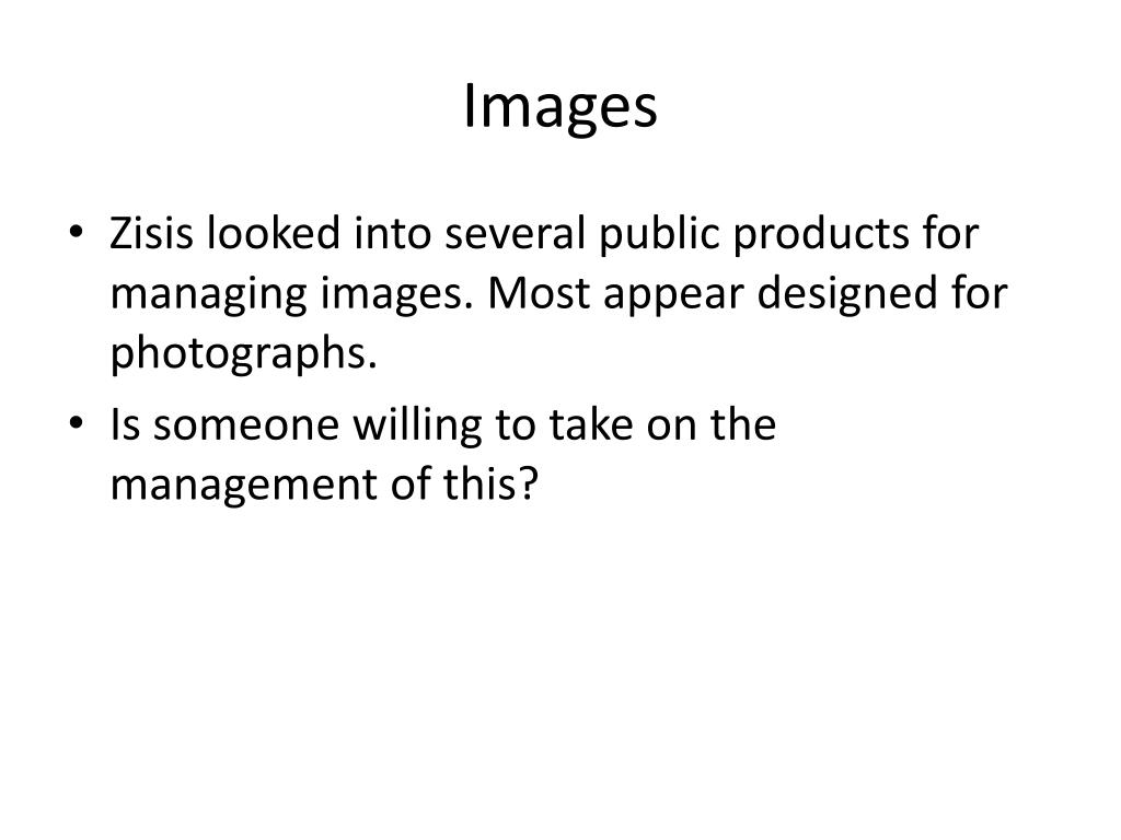 Images • Zisis looked into several public products for managing images. Most appear designed for photographs. • Is someone willing to take on the management of this?