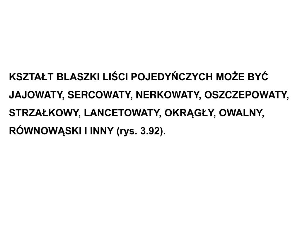 KSZTAŁT BLASZKI LIŚCI POJEDYŃCZYCH MOŻE BYĆ JAJOWATY, SERCOWATY, NERKOWATY, OSZCZEPOWATY, STRZAŁKOWY, LANCETOWATY, OKRĄGŁY, OWALNY, RÓWNOWĄSKI I INNY (rys. 3.92).