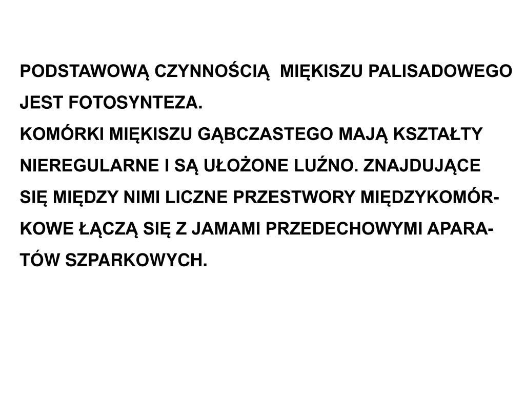 PODSTAWOWĄ CZYNNOŚCIĄ MIĘKISZU PALISADOWEGO JEST FOTOSYNTEZA. KOMÓRKI MIĘKISZU GĄBCZASTEGO MAJĄ KSZTAŁTY NIEREGULARNE I SĄ UŁOŻONE LUŹNO. ZNAJDUJĄCE SIĘ MIĘDZY NIMI LICZNE PRZESTWORY MIĘDZYKOMÓR-KOWE ŁĄCZĄ SIĘ Z JAMAMI PRZEDECHOWYMI APARA-TÓW SZPARKOWYCH.