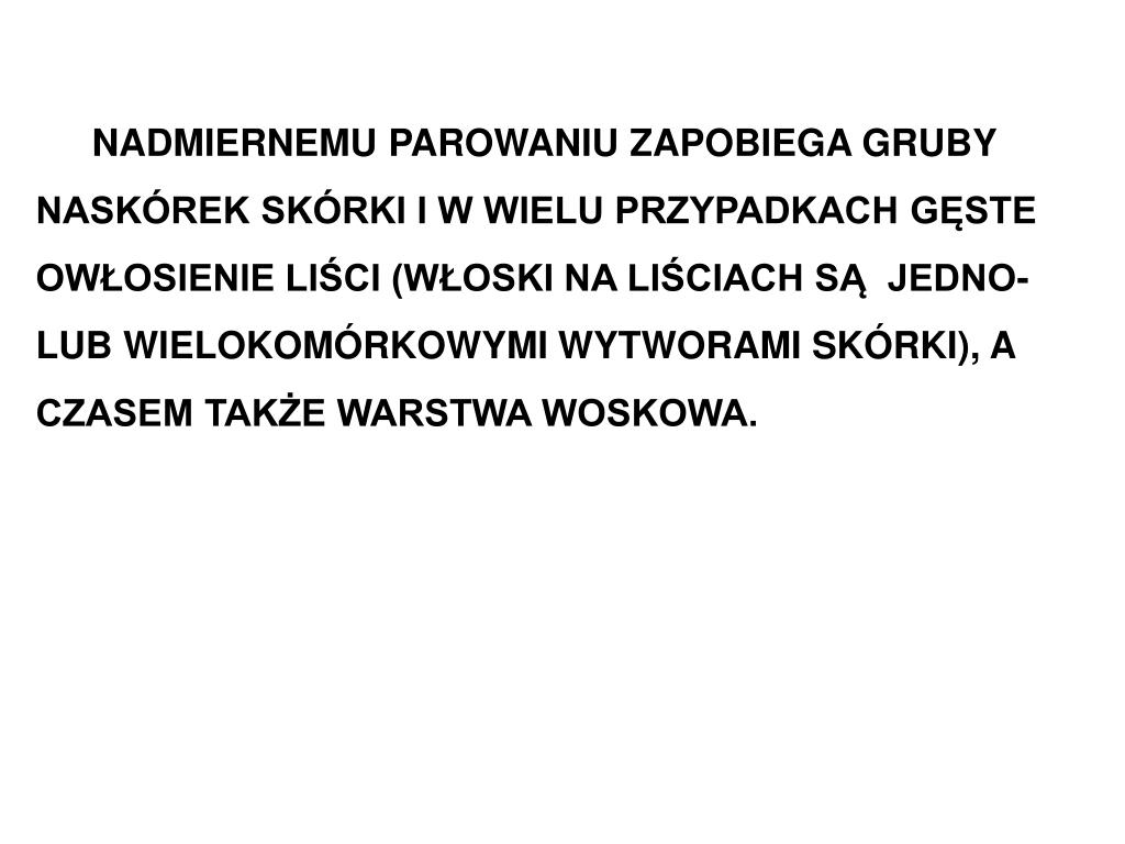 LIŚCIE A WILGOTNOŚĆ SWOISTĄ BUDOWĘ MAJĄ LIŚCIE ROŚLIN WYSTĘPUJĄ-CYCH W MIEJSCACH SUCHYCH, CZYLI tzw. KSEROFITÓW (SUCHOROSTÓW). KSEROFITY, BĘDĄC SZCZEGÓLNIE NARAŻONYMI NA SZYBKĄ UTRATĘ WODY MAJĄ LIŚCIE PRZYSTOSOWANE DO OGRANICZONEJ TRANSPIRACJI. SĄ ONE MAŁE I WĄSKIE, POKRYTE GRUBYM NABŁON-KIEM I CZĘSTO ZAOPATRZONE W GĘSTĄ OKRYWĘ WŁOSKÓW. APARATY SZPARKOWE SĄ UKRYTE W ZAGŁĘBIENIACH PONIŻEJ POWIERZCHNI BLASZKI.