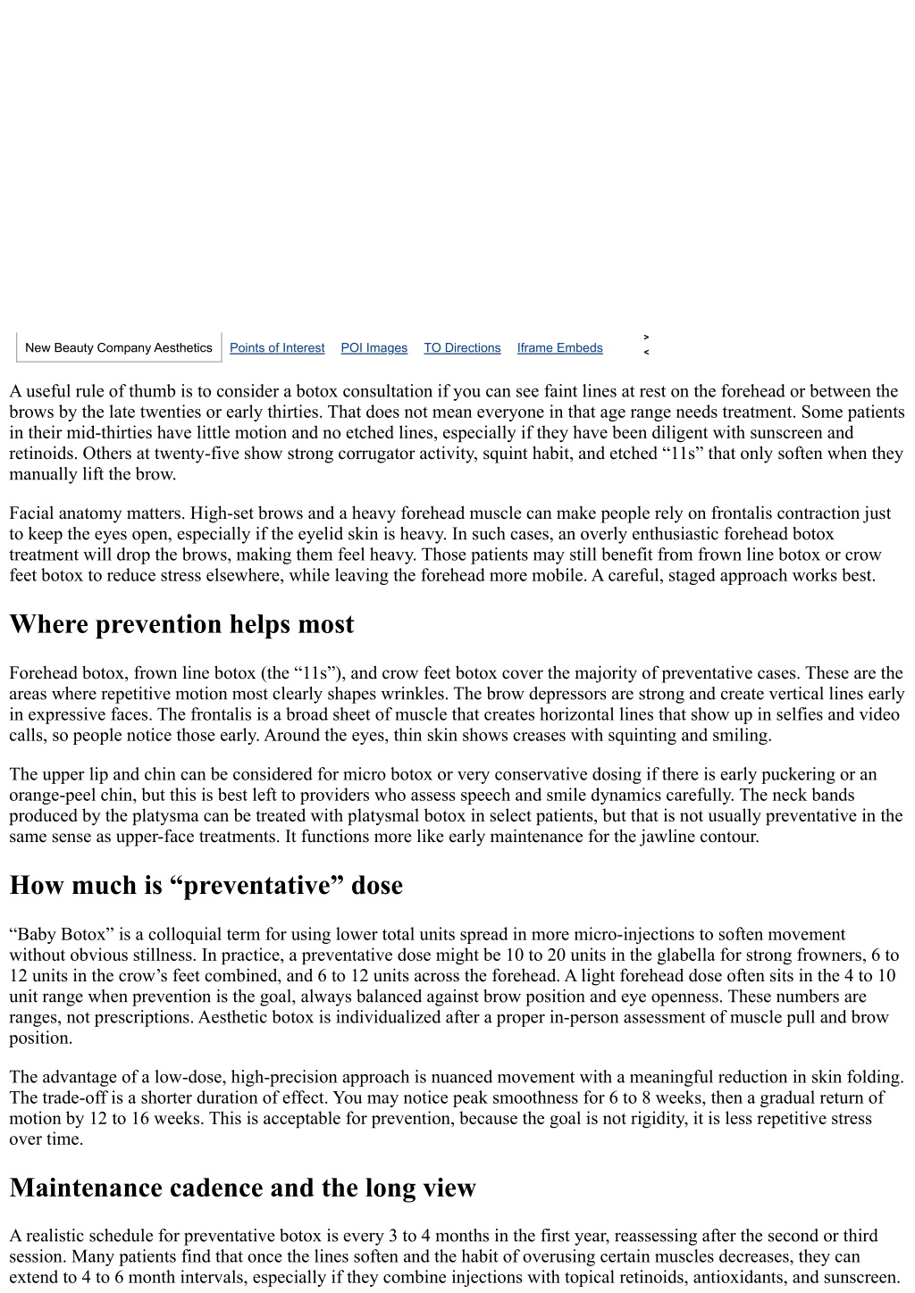 > New Beauty Company Aesthetics Points of Interest POI Images TO Directions Iframe Embeds < A useful rule of thumb is to consider a botox consultation if you can see faint lines at rest on the forehead or between the brows by the late twenties or early thirties. That does not mean everyone in that age range needs treatment. Some patients in their mid-thirties have little motion and no etched lines, especially if they have been diligent with sunscreen and retinoids. Others at twenty-five show strong corrugator activity, squint habit, and etched “11s” that only soften when they manually lift the brow. Facial anatomy matters. High-set brows and a heavy forehead muscle can make people rely on frontalis contraction just to keep the eyes open, especially if the eyelid skin is heavy. In such cases, an overly enthusiastic forehead botox treatment will drop the brows, making them feel heavy. Those patients may still benefit from frown line botox or crow feet botox to reduce stress elsewhere, while leaving the forehead more mobile. A careful, staged approach works best. Where prevention helps most Forehead botox, frown line botox (the “11s”), and crow feet botox cover the majority of preventative cases. These are the areas where repetitive motion most clearly shapes wrinkles. The brow depressors are strong and create vertical lines early in expressive faces. The frontalis is a broad sheet of muscle that creates horizontal lines that show up in selfies and video calls, so people notice those early. Around the eyes, thin skin shows creases with squinting and smiling. The upper lip and chin can be considered for micro botox or very conservative dosing if there is early puckering or an orange-peel chin, but this is best left to providers who assess speech and smile dynamics carefully. The neck bands produced by the platysma can be treated with platysmal botox in select patients, but that is not usually preventative in the same sense as upper-face treatments. It functions more like early maintenance for the jawline contour. How much is “preventative” dose “Baby Botox” is a colloquial term for using lower total units spread in more micro-injections to soften movement without obvious stillness. In practice, a preventative dose might be 10 to 20 units in the glabella for strong frowners, 6 to 12 units in the crow’s feet combined, and 6 to 12 units across the forehead. A light forehead dose often sits in the 4 to 10 unit range when prevention is the goal, always balanced against brow position and eye openness. These numbers are ranges, not prescriptions. Aesthetic botox is individualized after a proper in-person assessment of muscle pull and brow position. The advantage of a low-dose, high-precision approach is nuanced movement with a meaningful reduction in skin folding. The trade-off is a shorter duration of effect. You may notice peak smoothness for 6 to 8 weeks, then a gradual return of motion by 12 to 16 weeks. This is acceptable for prevention, because the goal is not rigidity, it is less repetitive stress over time. Maintenance cadence and the long view A realistic schedule for preventative botox is every 3 to 4 months in the first year, reassessing after the second or third session. Many patients find that once the lines soften and the habit of overusing certain muscles decreases, they can extend to 4 to 6 month intervals, especially if they combine injections with topical retinoids, antioxidants, and sunscreen.