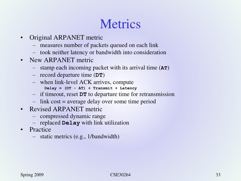 Metrics • Original ARPANET metric • measures number of packets queued on each link • took neither latency or bandwidth into consideration • New ARPANET metric • stamp each incoming packet with its arrival time (AT) • record departure time (DT) • when link-level ACK arrives, compute Delay = (DT - AT) + Transmit + Latency • if timeout, reset DT to departure time for retransmission • link cost = average delay over some time period • Revised ARPANET metric • compressed dynamic range • replaced Delay with link utilization • Practice • static metrics (e.g., 1/bandwidth) CSE30264