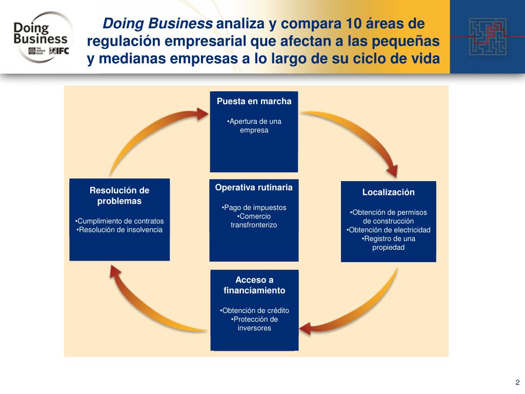 Doing Business analiza y compara 10 áreas de regulación empresarial que afectan a las pequeñas y medianas empresas a lo largo de su ciclo de vida • Puesta en marcha • Apertura de una empresa • Operativa rutinaria • Pago de impuestos • Comercio transfronterizo • Resolución de problemas • Cumplimiento de contratos • Resolución de insolvencia • Localización • Obtención de permisos de construcción • Obtención de electricidad • Registro de una propiedad • Acceso a financiamiento • Obtención de crédito • Protección de inversores 2 2