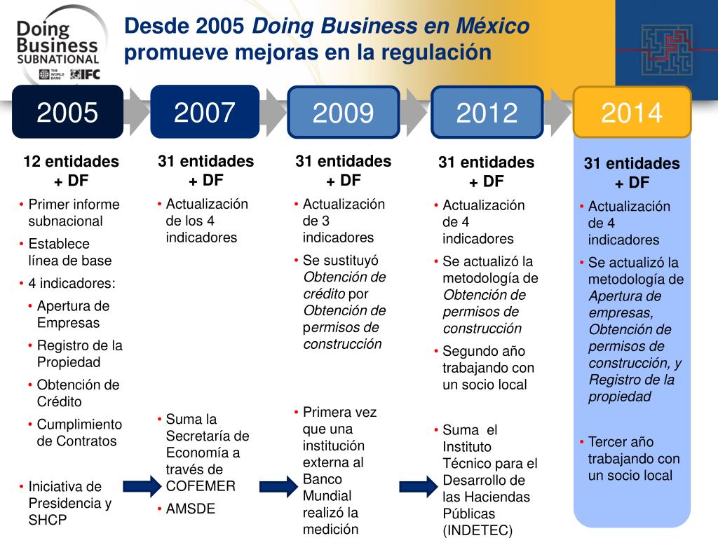 Desde 2005 Doing Business en México promueve mejoras en la regulación 2005 2007 2014 2009 2012 • 12 entidades + DF • Primer informe subnacional • Establece línea de base • 4 indicadores: • Apertura de Empresas • Registro de la Propiedad • Obtención de Crédito • Cumplimiento de Contratos • Iniciativa de Presidencia y SHCP • 31 entidades + DF • Actualización de los 4 indicadores • Suma la Secretaría de Economía a través de COFEMER • AMSDE • 31 entidades + DF • Actualización de 3 indicadores • Se sustituyó Obtención de crédito por Obtención de permisos de construcción • Primera vez que una institución externa al Banco Mundial realizó la medición • 31 entidades + DF • Actualización de 4 indicadores • Se actualizó la metodología de Obtención de permisos de construcción • Segundo año trabajando con un socio local • Suma el Instituto Técnico para el Desarrollo de las Haciendas Públicas (INDETEC) • 31 entidades + DF • Actualización de 4 indicadores • Se actualizó la metodología de Apertura de empresas, Obtención de permisos de construcción, y Registro de la propiedad • Tercer año trabajando con un socio local