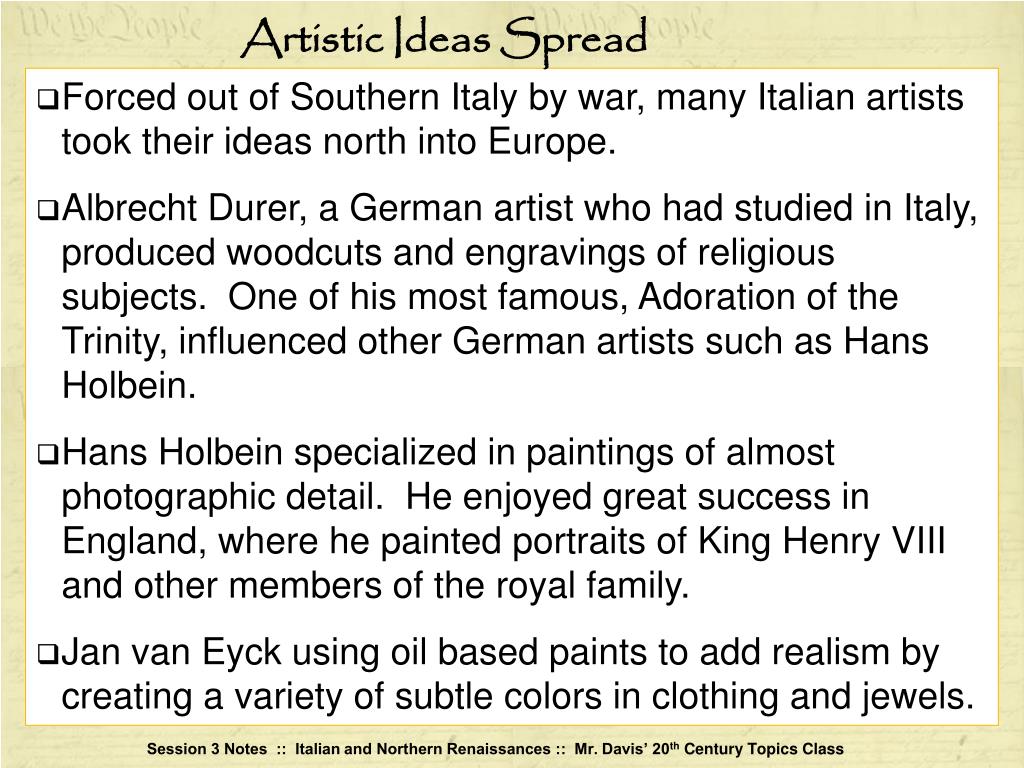 Artistic Ideas Spread • Forced out of Southern Italy by war, many Italian artists took their ideas north into Europe. • Albrecht Durer, a German artist who had studied in Italy, produced woodcuts and engravings of religious subjects. One of his most famous, Adoration of the Trinity, influenced other German artists such as Hans Holbein. • Hans Holbein specialized in paintings of almost photographic detail. He enjoyed great success in England, where he painted portraits of King Henry VIII and other members of the royal family. • Jan van Eyck using oil based paints to add realism by creating a variety of subtle colors in clothing and jewels.