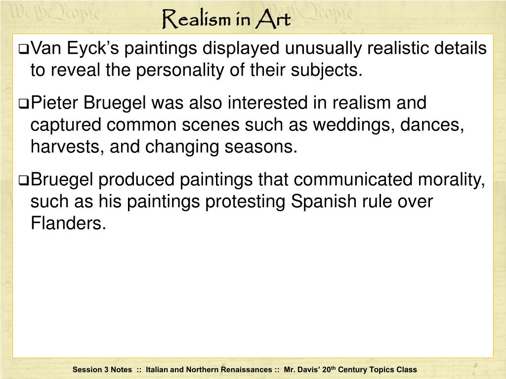 Realism in Art • Van Eyck’s paintings displayed unusually realistic details to reveal the personality of their subjects. • Pieter Bruegel was also interested in realism and captured common scenes such as weddings, dances, harvests, and changing seasons. • Bruegel produced paintings that communicated morality, such as his paintings protesting Spanish rule over Flanders.