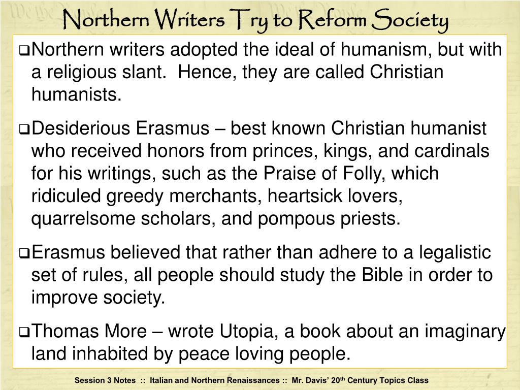 Northern Writers Try to Reform Society • Northern writers adopted the ideal of humanism, but with a religious slant. Hence, they are called Christian humanists. • Desiderious Erasmus – best known Christian humanist who received honors from princes, kings, and cardinals for his writings, such as the Praise of Folly, which ridiculed greedy merchants, heartsick lovers, quarrelsome scholars, and pompous priests. • Erasmus believed that rather than adhere to a legalistic set of rules, all people should study the Bible in order to improve society. • Thomas More – wrote Utopia, a book about an imaginary land inhabited by peace loving people.