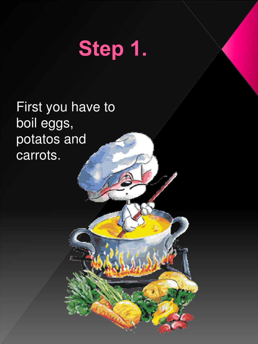 Traditional Polish dishes. Vegetable salad Pork loin with prume. Vegetable salad. Composition : 4 boiled eggs 5 (medium ) carrots Tin of peas Tin of corn 4 pickled cucumber 1 apple 3 potatos Mayo Pepper. Step 1. First you have to boil eggs , potatos and carrots .