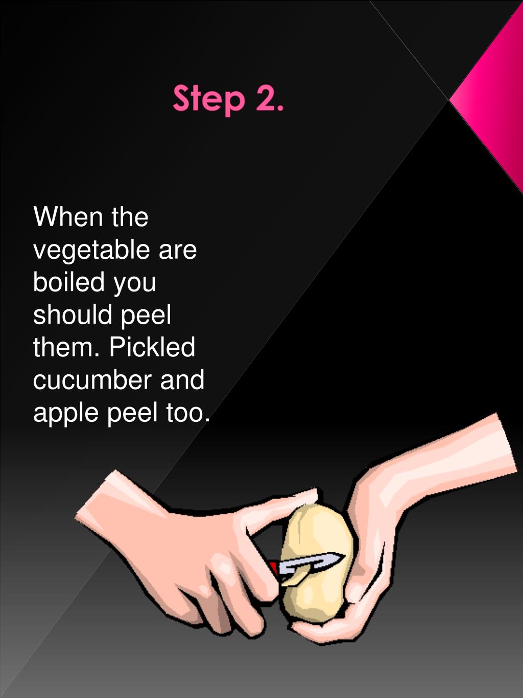 Step 2. Whenthevegetableareboiledyoushouldpeelthem. Pickledcucumber and applepeeltoo.