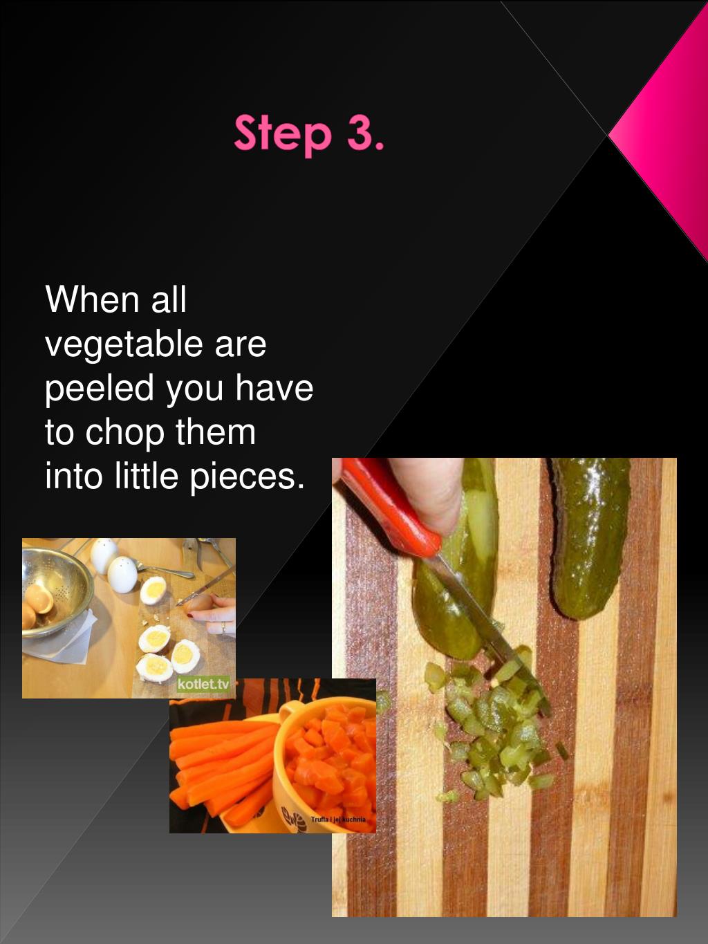 Step 3. Whenallvegetablearepeeledyouhave to chopthemintolittlepieces.