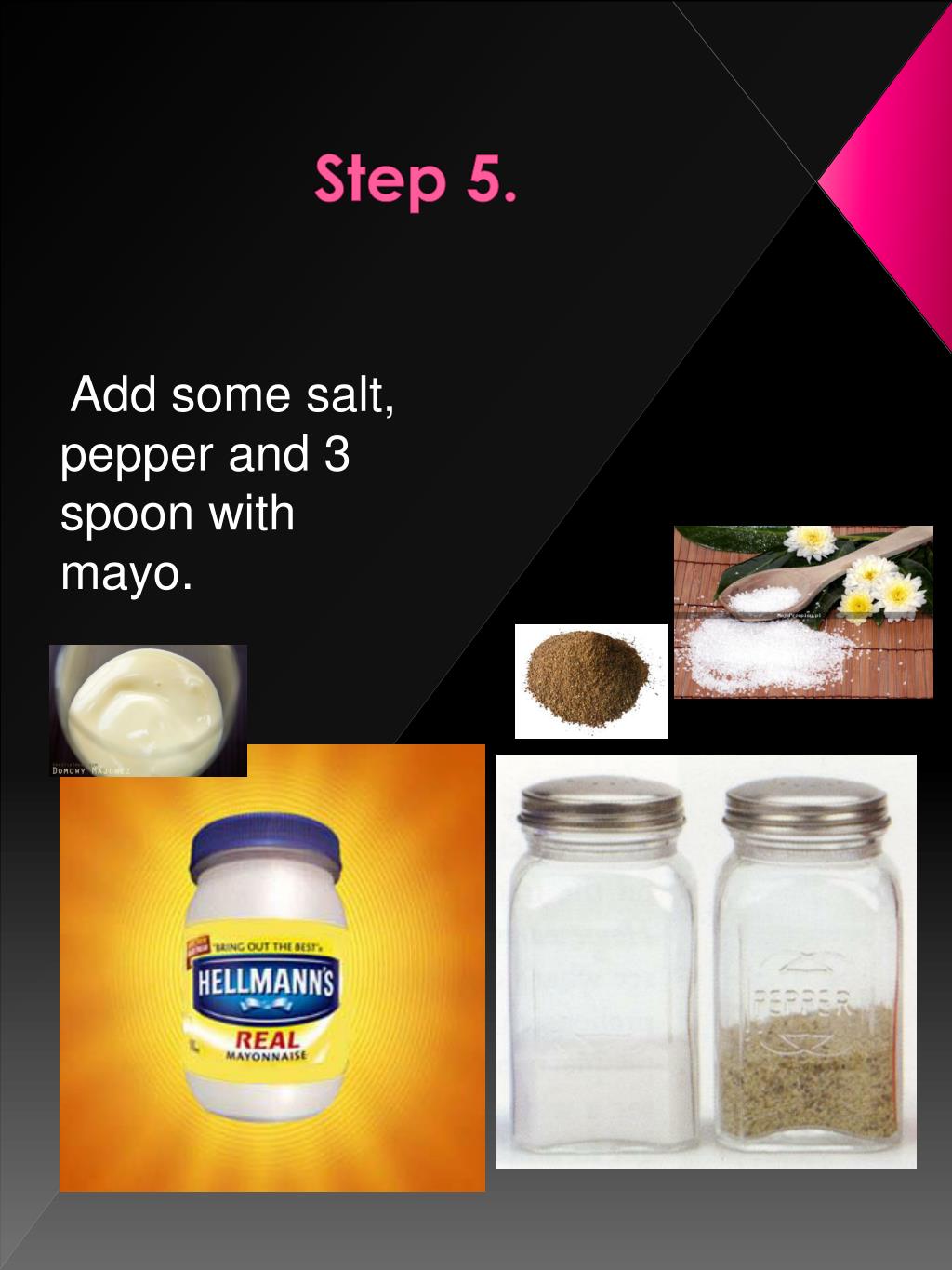 Step 5. Addsome salt, pepper and 3 spoonwithmayo.