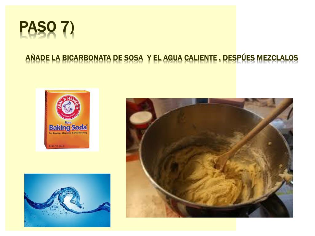 Paso 7) Añade la bicarbonata de sosa y el aguacaliente . Despúesmezclalos