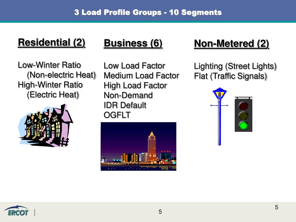3 Load Profile Groups - 10 Segments Residential (2) Low-Winter Ratio (Non-electric Heat) High-Winter Ratio (Electric Heat) Business (6) Low Load Factor Medium Load Factor High Load Factor Non-Demand IDR Default OGFLT Non-Metered (2) Lighting (Street Lights) Flat (Traffic Signals)
