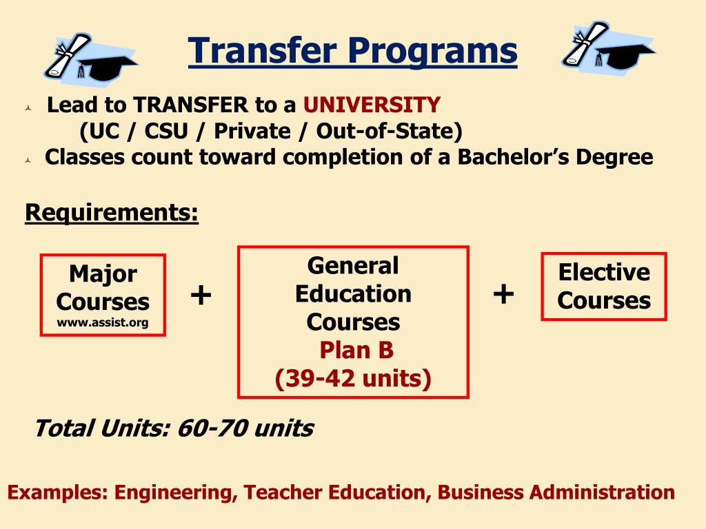 GeneralEducation CoursesPlan B (39-42 units) Elective Courses Major Courses www.assist.org + + Transfer Programs • Lead to TRANSFER to a UNIVERSITY (UC / CSU / Private / Out-of-State) • Classes count toward completion of a Bachelor’s Degree Requirements: Total Units: 60-70 units Examples: Engineering, Teacher Education, Business Administration