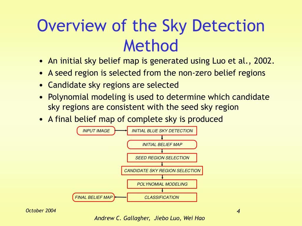 Improved Blue Sky Detection Using Polynomial Model Fit. Andrew C. Gallagher, Jiebo Luo, Wei Hao Presented By: Majid Rabbani Eastman Kodak Company. Motivation. Problem statement About 1/2 of consumer photos are taken outdoor About 1/3 of the photos contain significant pieces of sky