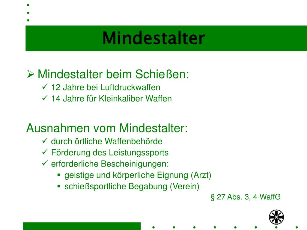 Mindestalter • Mindestalter beim Schießen: • 12 Jahre bei Luftdruckwaffen • 14 Jahre für Kleinkaliber Waffen Ausnahmen vom Mindestalter: • durch örtliche Waffenbehörde • Förderung des Leistungssports • erforderliche Bescheinigungen: • geistige und körperliche Eignung (Arzt) • schießsportliche Begabung (Verein) § 27 Abs. 3, 4 WaffG