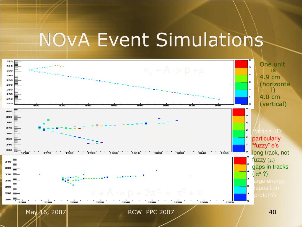 nm + A -> p +m- ne+A→p p+p- e- n + A -> p + 3p± + p0 + n NOvA Event Simulations One unit is 4.9 cm (horizontal) 4.0 cm (vertical) Particle ID: particularly “fuzzy” e’s long track, not fuzzy (m) gaps in tracks ( po ?) large energy deposition (proton?) RCW PPC 2007