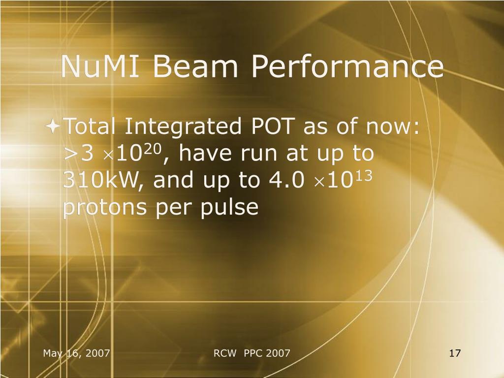 NuMI Beam Performance • Total Integrated POT as of now: >3 1020, have run at up to 310kW, and up to 4.0 1013 protons per pulse RCW PPC 2007