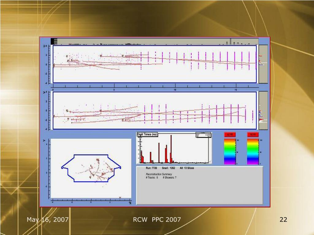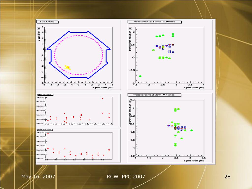 The MINOS Far Detector • Currently have ~20 kt-yr of Cosmic Ray data. • Observing single and multiple muons. LOTS • Observed upward going muons (neutrino interaction below the detector). ~300 events in current sample. • First physics paper on beam neutrinos submitted to Phys. Rev. Lett. • In operation with >2 E 20 Protons on the NuMI target RCW PPC 2007