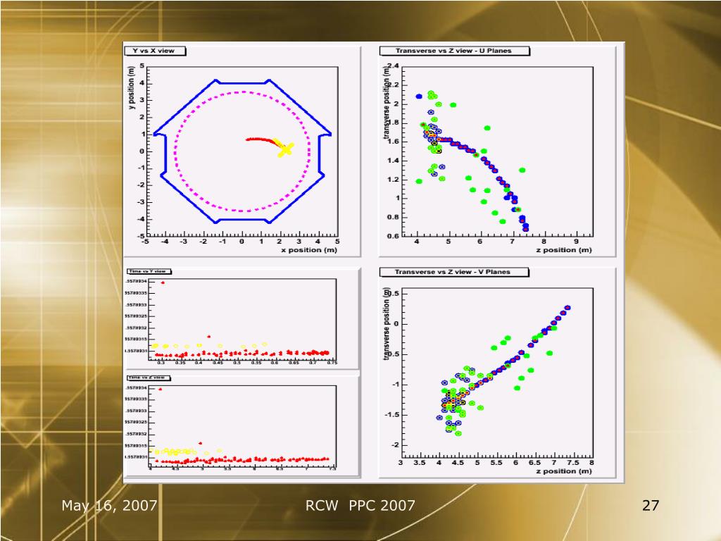 Neutrino Summary • MINOS data show nm disappearance at low energies at 6.2s (1.27x1020 Protons on Target) • The best fit oscillation parameters are (hep-ex 0607088) • Systematic uncertainties on Dm2 are ~40% of statistical • MINOS continues to take data—still to come: cross sections, ne appearance, sterile neutrino search RCW PPC 2007