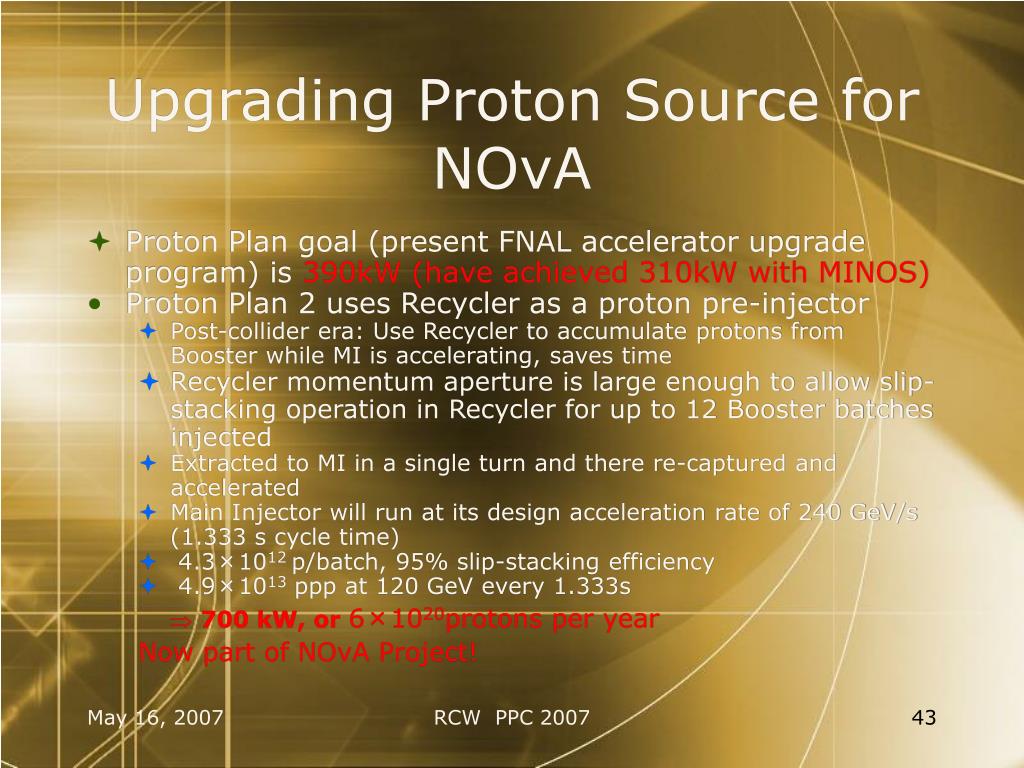 Upgrading Proton Source for NOvA • Proton Plan goal (present FNAL accelerator upgrade program) is 390kW (have achieved 310kW with MINOS) • Proton Plan 2 uses Recycler as a proton pre-injector • Post-collider era: Use Recycler to accumulate protons from Booster while MI is accelerating, saves time • Recycler momentum aperture is large enough to allow slip-stacking operation in Recycler for up to 12 Booster batches injected • Extracted to MI in a single turn and there re-captured and accelerated • Main Injector will run at its design acceleration rate of 240 GeV/s (1.333 s cycle time) • 4.3×1012 p/batch, 95% slip-stacking efficiency • 4.9×1013 ppp at 120 GeV every 1.333s 700 kW, or 6×1020protons per year Now part of NOvA Project! RCW PPC 2007