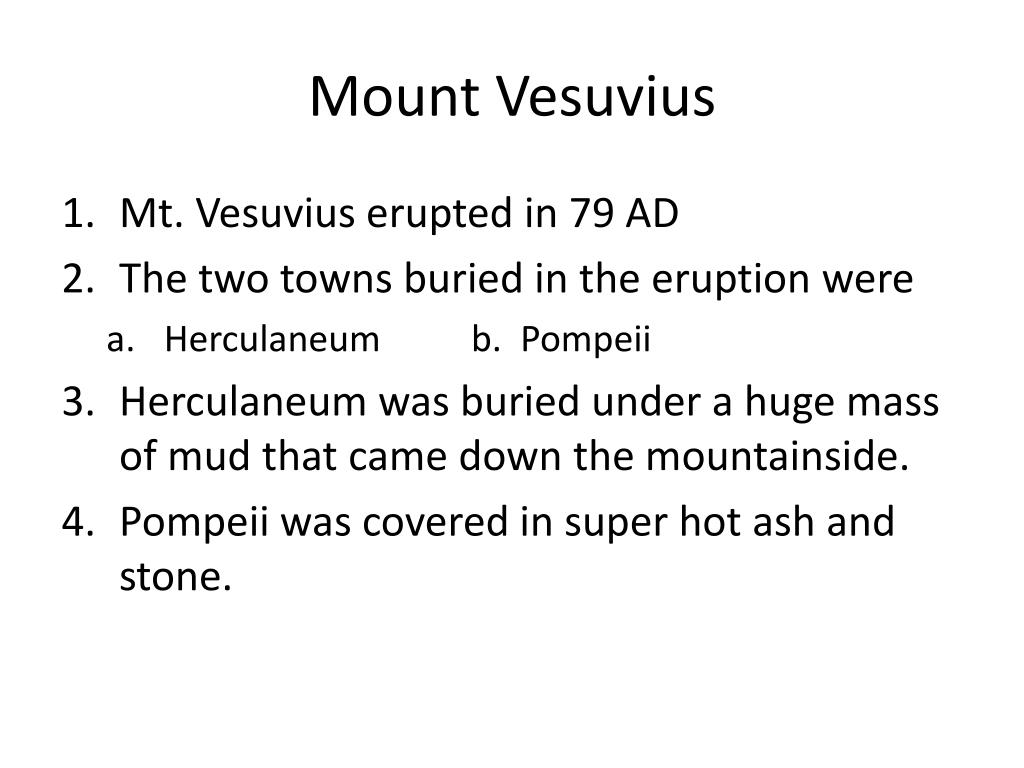 Mount Vesuvius • Mt. Vesuvius erupted in 79 AD • The two towns buried in the eruption were • Herculaneum b. Pompeii • Herculaneum was buried under a huge mass of mud that came down the mountainside. • Pompeii was covered in super hot ash and stone.