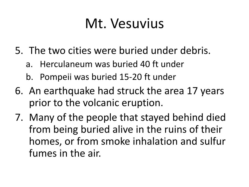 Mt. Vesuvius • The two cities were buried under debris. • Herculaneum was buried 40 ft under • Pompeii was buried 15-20 ft under • An earthquake had struck the area 17 years prior to the volcanic eruption. • Many of the people that stayed behind died from being buried alive in the ruins of their homes, or from smoke inhalation and sulfur fumes in the air.