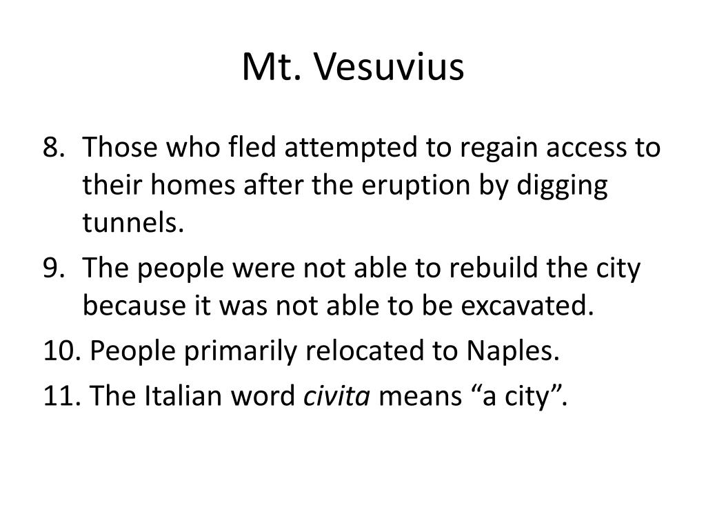 Mt. Vesuvius • Those who fled attempted to regain access to their homes after the eruption by digging tunnels. • The people were not able to rebuild the city because it was not able to be excavated. • People primarily relocated to Naples. • The Italian word civita means “a city”.