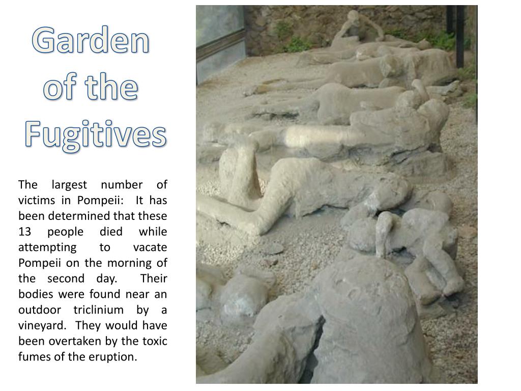 Garden of the Fugitives The largest number of victims in Pompeii: It has been determined that these 13 people died while attempting to vacate Pompeii on the morning of the second day. Their bodies were found near an outdoor tricliniumby a vineyard. They would have been overtaken by the toxic fumes of the eruption.