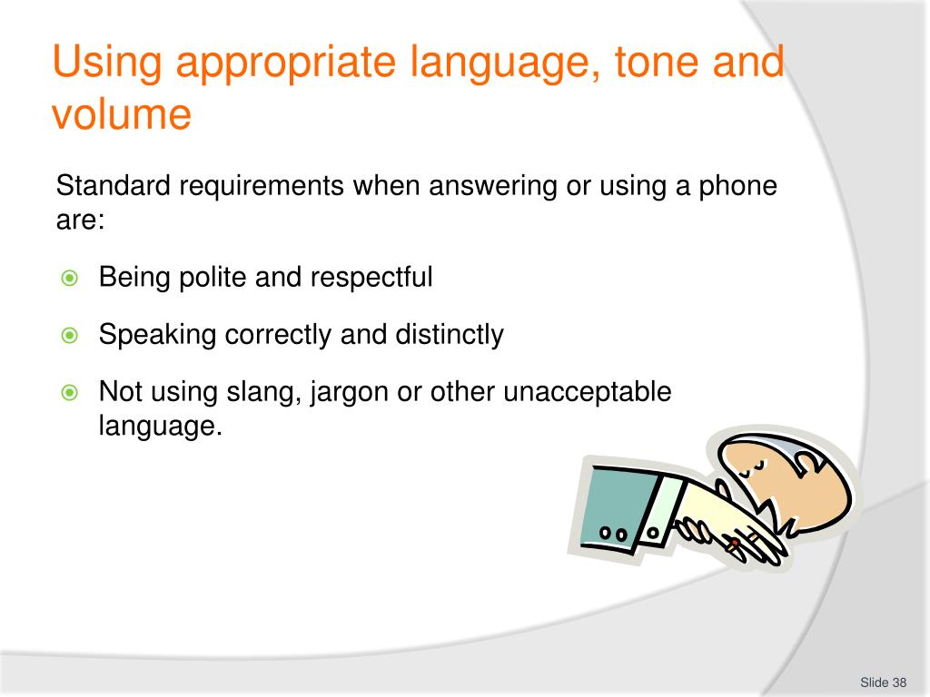Using appropriate language, tone and volume Standard requirements when answering or using a phone are: • Being polite and respectful • Speaking correctly and distinctly • Not using slang, jargon or other unacceptable language.