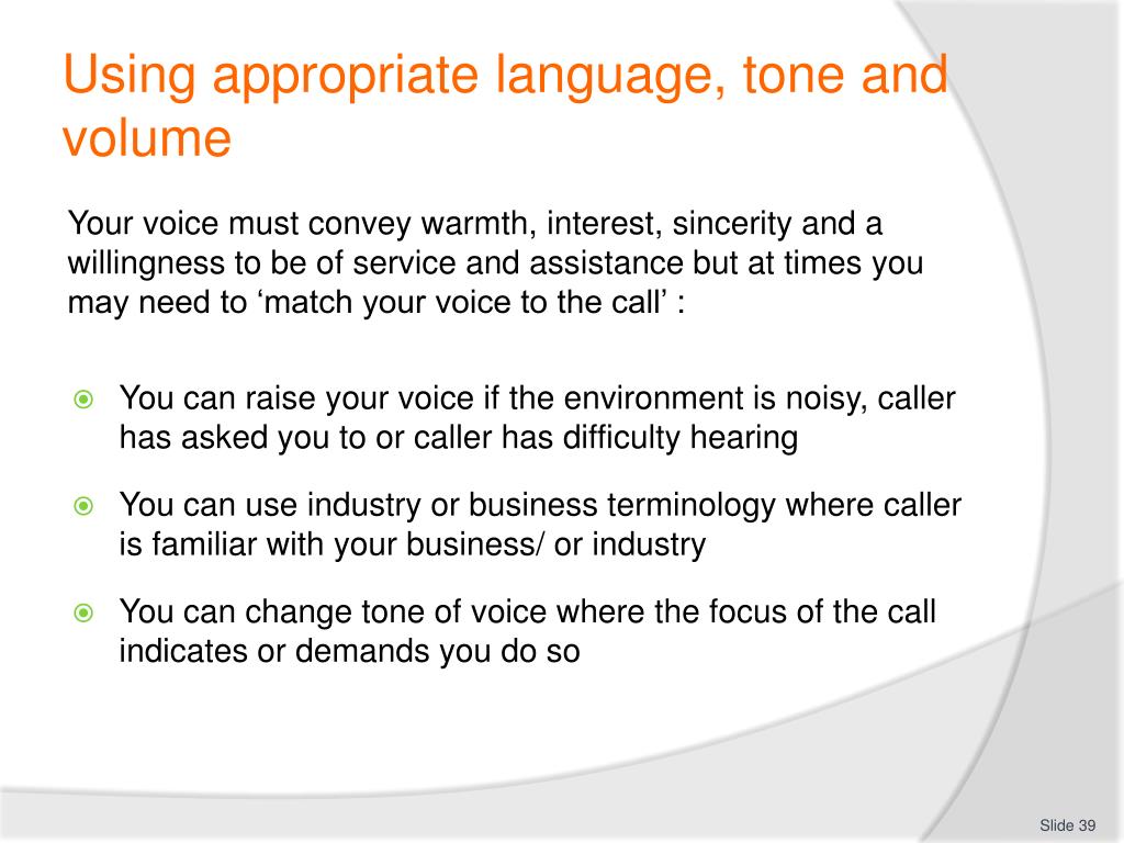 Using appropriate language, tone and volume Your voice must convey warmth, interest, sincerity and a willingness to be of service and assistance but at times you may need to ‘match your voice to the call’ : • You can raise your voice if the environment is noisy, caller has asked you to or caller has difficulty hearing • You can use industry or business terminology where caller is familiar with your business/ or industry • You can change tone of voice where the focus of the call indicates or demands you do so