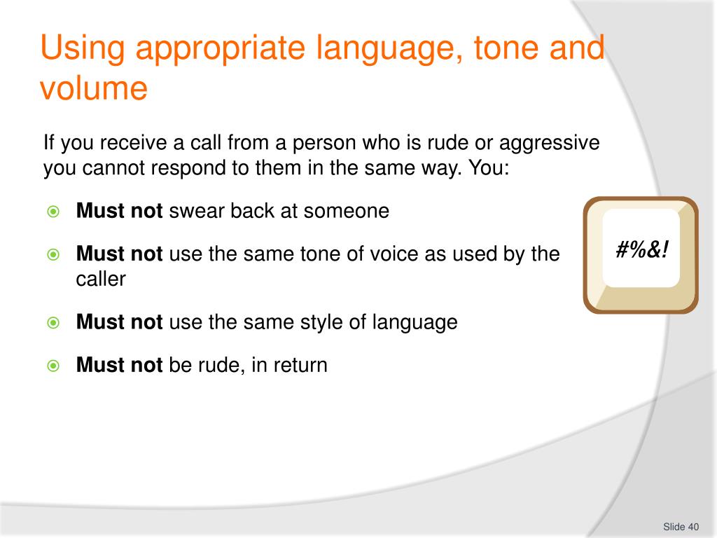 Using appropriate language, tone and volume If you receive a call from a person who is rude or aggressive you cannot respond to them in the same way. You: • Must not swear back at someone • Must not use the same tone of voice as used by the caller • Must not use the same style of language • Must not be rude, in return