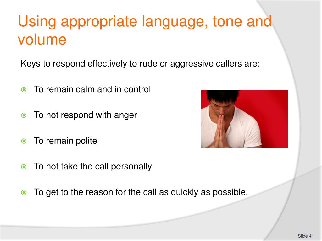 Using appropriate language, tone and volume Keys to respond effectively to rude or aggressive callers are: • To remain calm and in control • To not respond with anger • To remain polite • To not take the call personally • To get to the reason for the call as quickly as possible.
