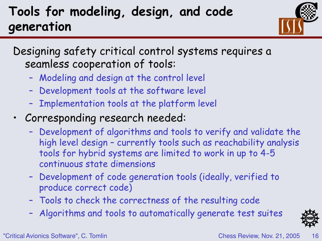Tools for modeling, design, and code generation Designing safety critical control systems requires a seamless cooperation of tools: • Modeling and design at the control level • Development tools at the software level • Implementation tools at the platform level • Corresponding research needed: • Development of algorithms and tools to verify and validate the high level design – currently tools such as reachability analysis tools for hybrid systems are limited to work in up to 4-5 continuous state dimensions • Development of code generation tools (ideally, verified to produce correct code) • Tools to check the correctness of the resulting code • Algorithms and tools to automatically generate test suites "Critical Avionics Software", C. Tomlin